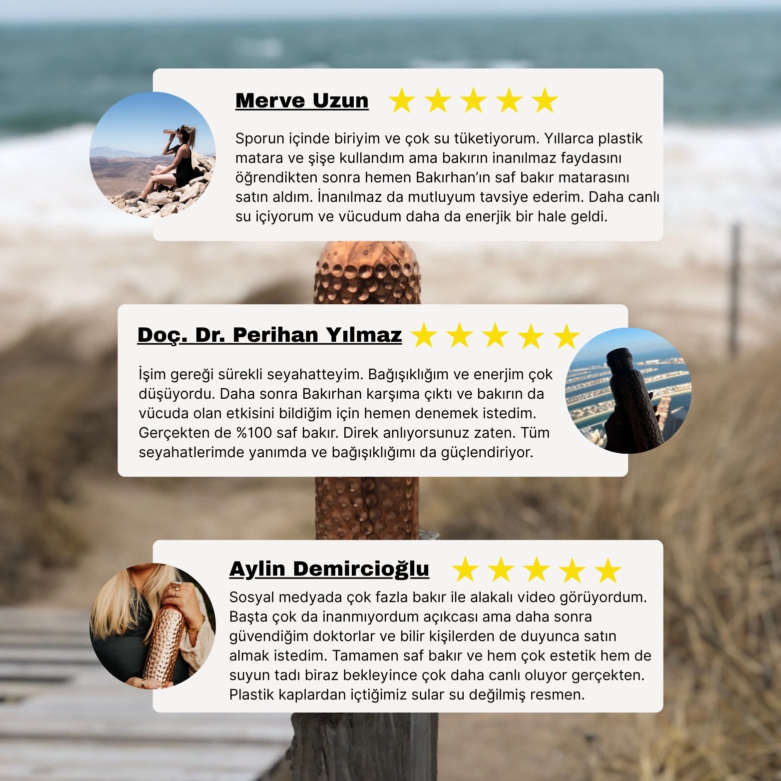 Bakırhan sayesinde bakırın değerini anladım. Araştırdım da zaten. Şehir hayatında sürekli plastiklere maruz kalıyoruz ve vücudumuza inanılmaz zararı var bu durumun. Artık sürekli masamda bulunduruyorum bu matarayı. Tavsiye ederim herkese.