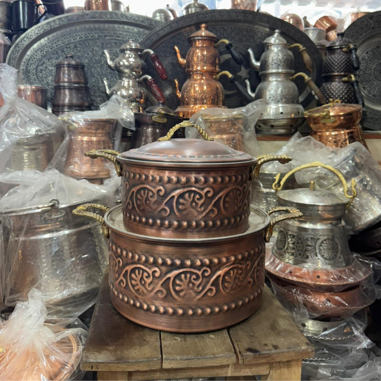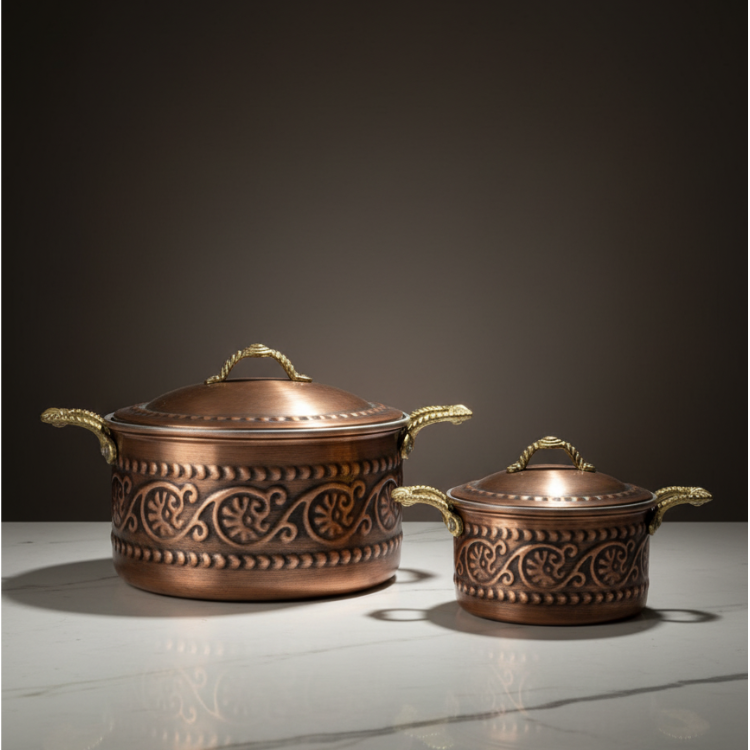 Kabartma İşlemeli Saf Bakır Tencere Seti (2'li Set)